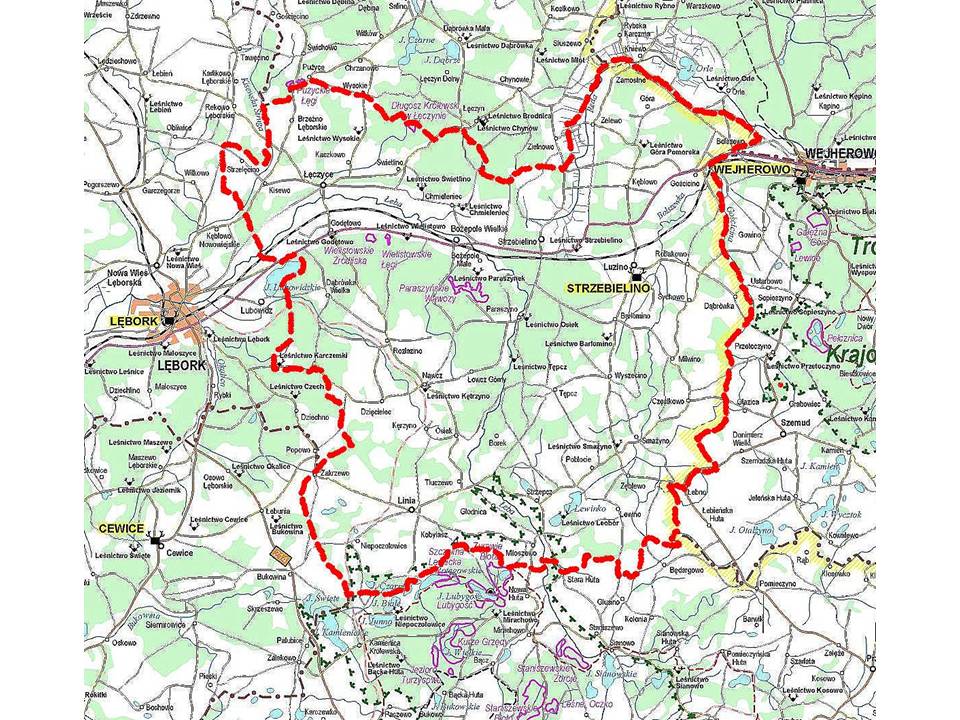 Nadleśnictwo Strzebielino jest jednym z 15 nadleśnictw wchodzących w skład RDLP w Gdańsku. Położone jest na terenie województwa pomorskiego, powiatu wejherowskiego. Zasięgiem swym obejmuje 8 gmin: głównie Luzino, Łęczyce i Linia a także Wejherowo, Gniewino, Szemud, Cewice i Kartuzy. Największą miejscowością w zasięgu administracyjnym jest wieś Luzino, gdzie mieści się też siedziba nadleśnictwa.